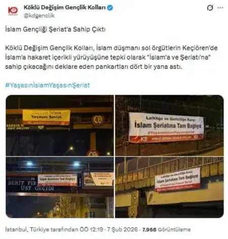 Köklü Değişim'in sosyal medya hesabında, "Köklü Değişim Gençlik Kolları, İslam düşmanı sol örgütlerin Keçiören'de İslam'a hakaret içerikli yürüyüşüne tepki olarak 'İslam'a ve Şeriatı'na' sahip çıkacağını deklare eden pankartları dört bir yana astı" ifadeleri kullanıldı.