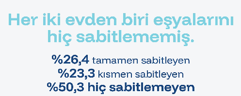 Evde fiziksel tedbir alma oranları ise oldukça düşük. Katılımcıların yalnızca yüzde 26.4’ü evdeki eşyalarını tamamen sabitlediğini, yüzde 23.3’ü kısmen sabitlediğini, yüzde 50.3’ü ise hiç sabitlemediğini ifade ediyor. Bu durum, deprem riskine dair yüksek farkındalığa rağmen, eyleme dönüşen hazırlık düzeyinin sınırlı kaldığını gösteriyor.