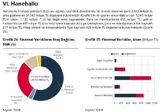 Hanehalkı finansal varlıkları 2025 yılı üçüncü çeyreklik döneminde bir önceki döneme göre 2 trilyon 473 milyar TL artış göstererek 24 trilyon 942 milyar TL düzeyine yükseldi.