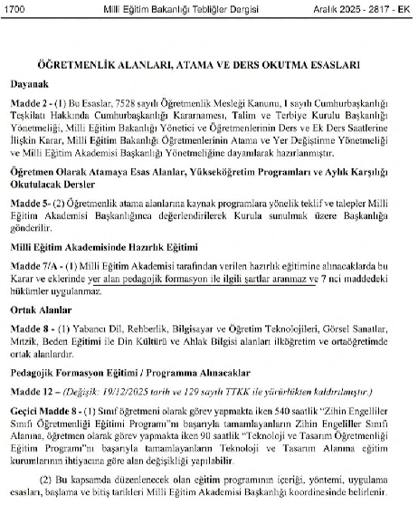 Milli Eğitim Bakanlığı, Aralık 2025 tarihli ve 2817 sayılı Tebliğler Dergisi'nde yayımladığı "Öğretmenlik Alanları, Atama ve Ders Okutma Esasları"nda kritik bir değişikliğe imza attı. Yapılan düzenlemeyle, öğretmen adaylarının yıllardır gündeminde olan pedagojik formasyon uygulaması, belirli şartlar altında yürürlükten kaldırıldı.