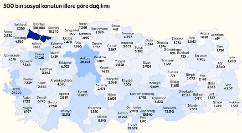 81 ilde 500 bin sosyal konut inşa edilecek. Projeyle İstanbul’da TOKİ eliyle ilk kez kiralık konut verilecek. 2 milyon kişiye konut sağlanması planlanıyor.