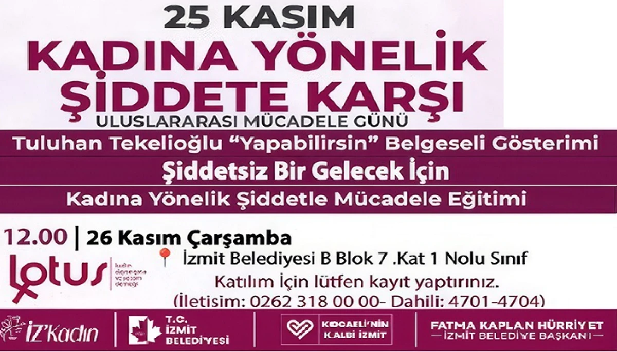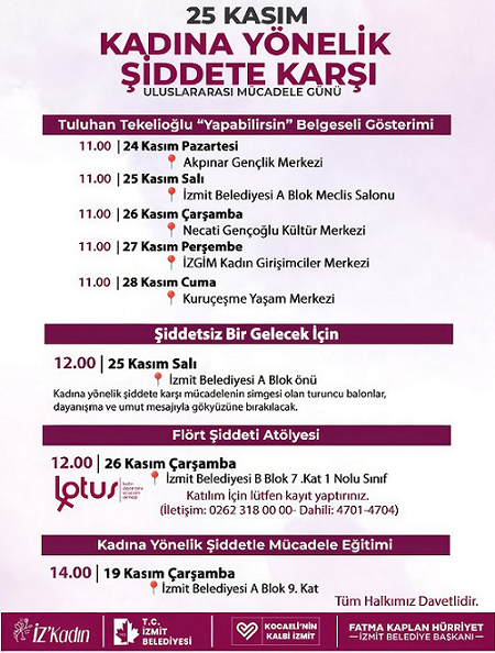 İzmit Belediyesi Kadın ve Aile Hizmetleri Müdürlüğü, 25 Kasım Kadına Yönelik Şiddetle Uluslararası Mücadele Günü kapsamında farkındalık oluşturmak ve toplumsal bilinci güçlendirmek amacıyla bir dizi etkinliği hayata geçiriyor. Etkinlikler, 19–30 Kasım tarihleri arasında farklı günlerde ve merkezlerde gerçekleştirilecek.